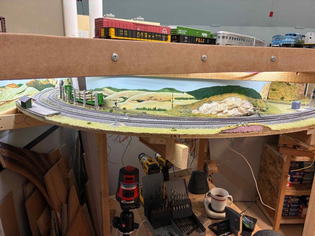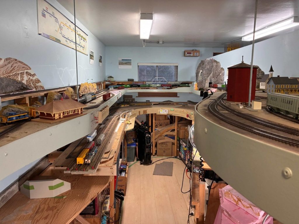 The layout is 24’8” X 10’6”, HO scale in a former garage, accessed by stairs, and under construction since late 2021. Track is ready made or hand laid. Where possible, I have reused parts of previous layouts. It has two levels and will have a third staging level. The upper level is close to being able to host operating sessions. The Nicola Sub will be visible for 65 feet. The Grassland sub will take 180 feet to reach South Kamloops. There will be three 20+ foot sidings. The staging area will have seven up to 40 foot staging tracks plus two tracks for passenger trains and a reversing loop. A continuous loop to loop route can be set for 410 foot run. I estimate the layout will take a crew of six including an RTC.
