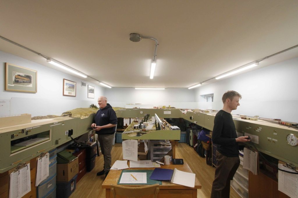 The E&N Railway in N scale is a 22’ by 13’ around-the-walls layout built on a two-foot deep shelf, with an additional upper shelf at one end. The modeled portion of the layout represents the E&N Victoria subdivision from Victoria (mile 0.8) to Chemainus (mile 51.2), serving freight customers at Victoria, Esquimalt, Langford, Duncan, and Chemainus; as well as the E&N Lake Cowichan subdivision from Hayward (mile 41.6, Victoria subdivision) to Lake Cowichan (mile 18.0, represented by the upper staging yard). Staging at the north end of the layout represents Wellcox, and at the south end represents the E&N’s Albion Yard and the CNR’s Point Ellice Yard in Victoria.