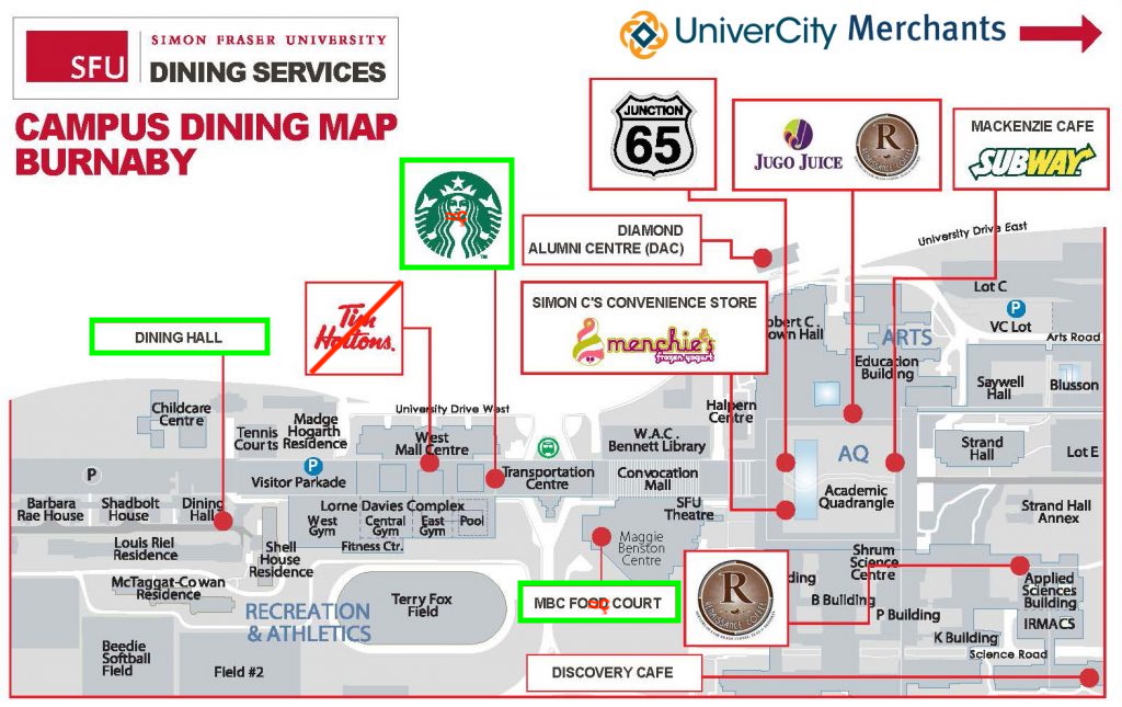 Located on UniverCity High Street, east of SFU Burnaby’s main campus, UniverCity offers retail shops, a grocery store and a variety of dining venues—ranging from coffee shops, quick-serve food, international cuisine and full-service restaurants—there are great options available!